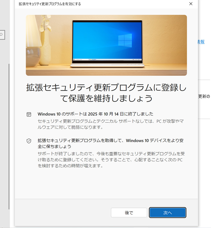 「拡張セキュリティ更新プラグラムに登録して、デバイスのセキュリティを維持しましょう。」
