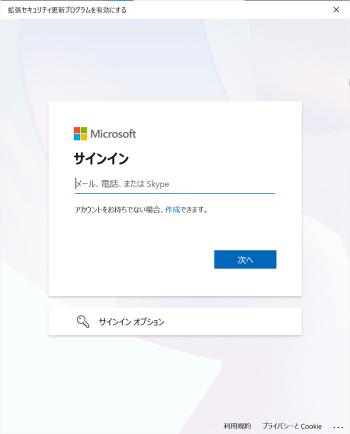 「次へ」をクリックすると、Microsoftアカウントのサインイン(ログイン)が表示される。